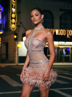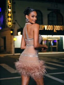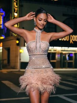 Get ready to turn heads with our Tamisha Halterneck Rhinestone Feather Mini Dress! Designed to make you stand out, this dress features a halterneck design, sparkling rhinestones, and playful feather detailing. Perfect for a night out, this dress will have you feeling confident and glamorous.