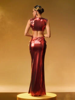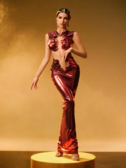 Introducing the Taralynn Ruffle Ruched Metallic Skirt Set In Red! Make a statement with this stunning set, featuring a ruffled top and ruched metallic skirt. Stand out and feel confident in this eye-catching ensemble. Perfect for special occasions and nights out, elevate your style with this must-have piece!