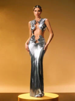 Add some sparkle and shine to your wardrobe with this Taralynn Ruffle Ruched Metallic Skirt Set in Silver! The ruffle detailing and ruched design add a touch of elegance, while the metallic silver fabric catches the light and turns heads. Perfect for any special occasion, this set is sure to make you feel confident and stylish. Upgrade your collection today!