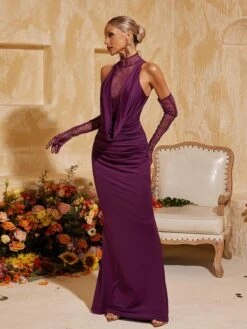 Indulge in luxurious elegance in the Tenley Halterneck Lace Maxi Dress With Gloves. The intricate lace design and flattering halterneck silhouette will make you feel like a goddess. Complete the look with the included gloves for a touch of sophistication. Make a statement at your next special occasion.