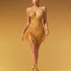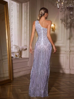 Elevate your style with the Tyssa One Shoulder Fringe Split Maxi Dress. Featuring a chic one-shoulder design and playful fringe detailing, this dress effortlessly combines elegance with a touch of fun. The high slit adds a flattering silhouette and allows for graceful movement, making it perfect for special occasions or evening events. Stand out with confidence and sophistication in this stunning maxi dress.