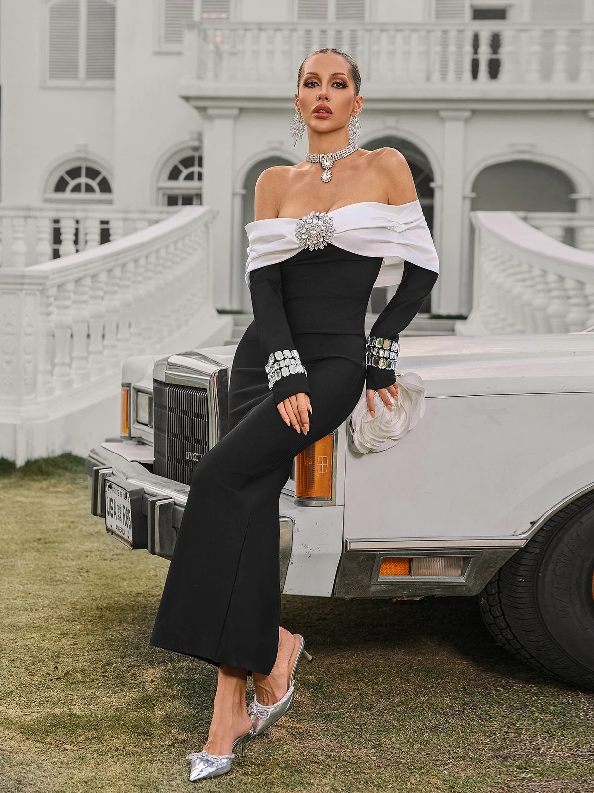Flaunt your style with our Uvandra Off Shoulder Crystal Bandage Maxi Dress! Designed with a stunning off-shoulder neckline and delicate crystal detailing, this dress effortlessly combines elegance and allure. Made with high-quality materials, it provides a comfortable and flattering fit. Be the center of attention at any event with this eye-catching dress!