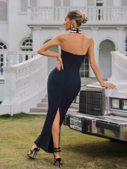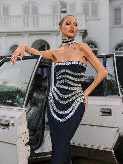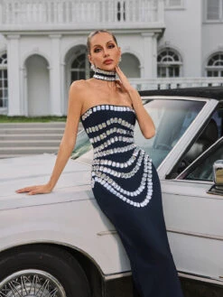 Indulge in the ultimate fashion statement with the Vaelith Strapless Crystal Bandage Maxi Dress With Choker. The fitted bandage design accentuates your curves while the crystal detailing adds a touch of glamour and luxury. Perfect for any special occasion, this dress will make you feel confident and stylish!