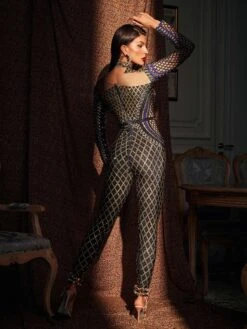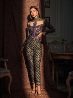 Get ready to dazzle in the Venetia Printed Rhinestone Jumpsuit! The intricate print and sparkling rhinestones make a bold fashion statement. Perfect for any special occasion, this jumpsuit will make you stand out and feel confident. Elevate your wardrobe with this stunning piece!