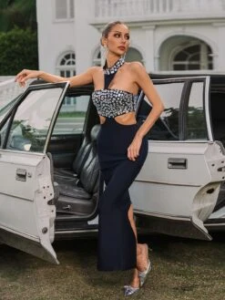 Unleash your inner glamour with the Vyxaria Halterneck Cutout Crystal Bandage Midi Dress. This stunning dress features a halterneck design and cutout details, enhanced by sparkling crystal accents. Perfect for any special occasion, it will make you feel confident and elegant. Steal the spotlight and turn heads with this dress!