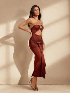 Elevate your style with the Wexmir Strapless Cutout Draped Midi Dress. This elegant dress features a flattering strapless design and tasteful cutouts that highlight your silhouette. The draped fabric adds a touch of sophistication, making it perfect for special occasions or evening events. Experience confidence and grace in a dress that effortlessly combines modern flair with timeless charm.