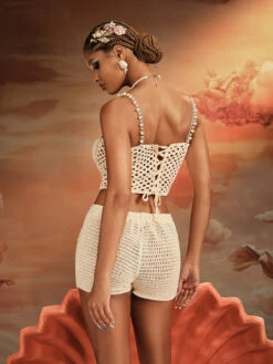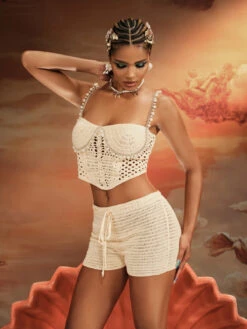 Indulge in effortless style and comfort with the Wiebke Spaghetti Pearl Knit Shorts Set In Beige. Crafted with a pearl knit fabric, this set offers both a luxurious feel and a chic look. Perfect for lounging at home or a day out, this set will elevate your wardrobe and make you feel confident and elegant.