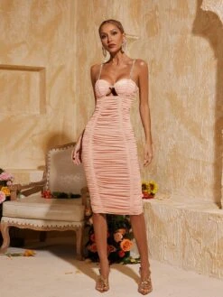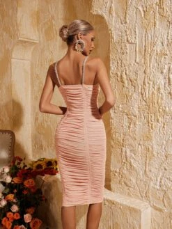 Feel confident and glamorous in the Xandria Spaghetti Crystal Ruched Midi Dress. Adorned with sparkling crystals and featuring a figure-flattering ruched design, this dress will turn heads at any event. Embrace your inner fashionista and make a statement with this sophisticated and elegant piece.