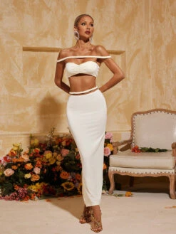 Elevate your style with the Xavion Off Shoulder Skirt Set In White. The trendy off-shoulder design adds a touch of sophistication to this set, while the rich white color effortlessly complements your skin tone. Perfect for any occasion, this set is a must-have for a fashion-forward wardrobe.