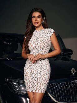 Elevate your style game with the stunning Zaida Circle Embellished Mini Dress. The intricate embellished detailing creates an eye-catching circle pattern, while the mini length adds a touch of playfulness. Perfect for any occasion, this dress will make you stand out in any crowd.