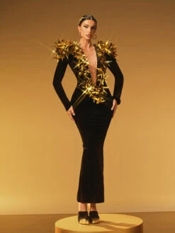 Make a stunning statement in the Zarael Plunge Neck Star Split Maxi Dress. This elegant dress features a deep plunge neckline and a celestial star pattern that adds a unique sparkle. The slit enhances your silhouette and offers graceful movement, perfect for any evening event or celebration. Designed to combine comfort with bold style, it’s your go-to choice for unforgettable moments.